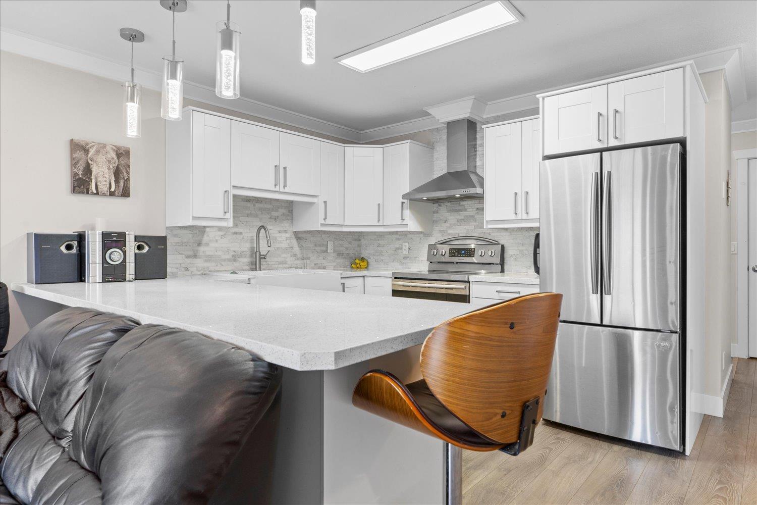 Be impressed by this large THREE BEDROOM corner condo at McIntosh Village! You'll love the floor to ceiling renovations and an abundance of living space. This suite features trendy laminate floors, updated LED lighting, crown molding, and in-suite laundry. A gorgeous white kitchen with quartz counters and an eating bar is the focal point of the open living area and offers plenty of cabinetry. From the living area, step out onto the private balcony with mature landscaping all around. The bathroom is also beautifully updated with slate tile and white cabinetry. Extra perks include an in-condo storage room, affordable strata fees, and top-floor living. Conveniently located between Sardis and Chilliwack's rejuvenated downtown, this condo is the ideal home for a first time buyer. SHOWS A TEN! (id:9345)...